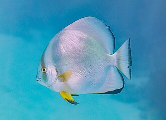 ![]() Orbicular (round body) batfish (Platax orbicularis), Red Sea, Egypt. It belongs to the family Ephippidae, the spadefishes and batfishes. This species is found in the Indo-Pacific but has been recorded outside its native range in the western Atlantic Ocean. The adult can reach a total length of 40 centimetres (16 in). Change image |